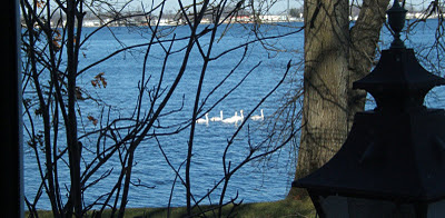 A good day for a first snow. It is, after all, the shortest day of the year and the first day of Winter. It may well be around for a white Christmas--it depends upon the Swans. I still feel that ice on the lake is reliably predicted by the presence of the Mute Swans in the water at Big Island. So far they have just done a fly by. I'll keep you "posted."
